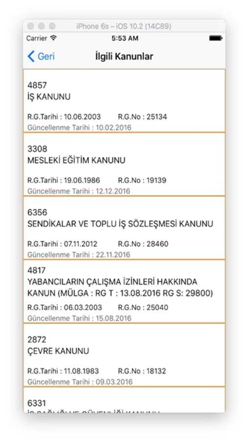 Aşağıdaki kanunlar Uygulamada yer almaktadır.