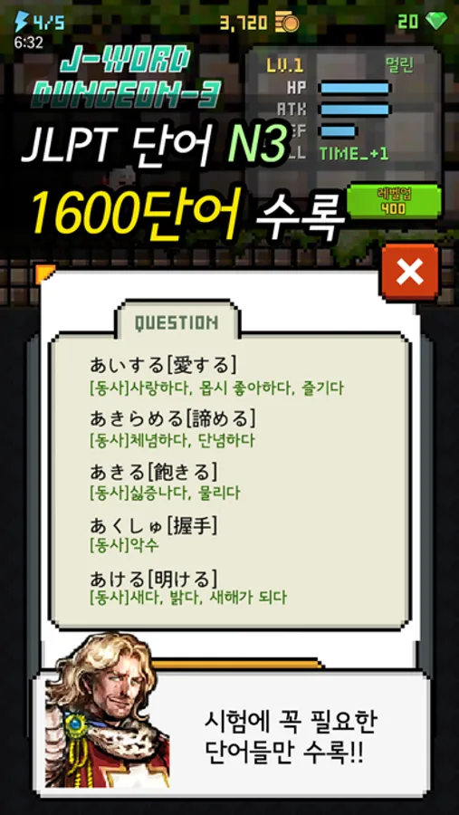 '일단어 던전3'에는 JLPT N3 등급 1600단어가 수록되어 있습니다.