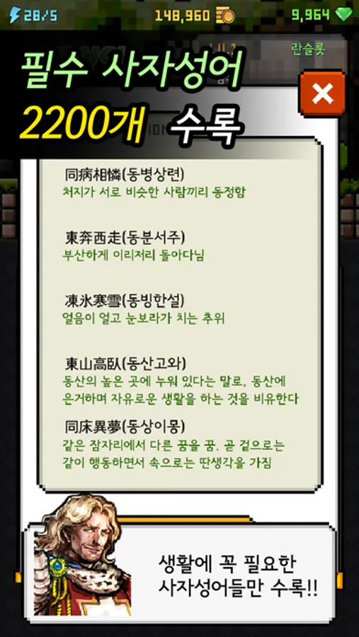 '사자성어 던전'에는 생활 필수 사자성어 2200개가 수록되어 있습니다.