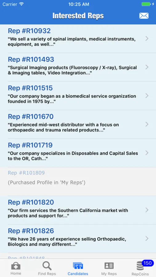 After reviewing pre-screened candidates, you may instantly acquire complete profiles with contact information for any Rep you decide to contact.