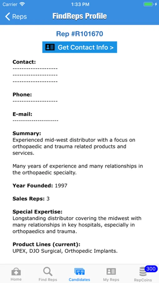 FindReps Profiles provide detailed information about each Rep, for example, Company Description, Special Expertise, primary Call Points, Sales Territory and Product Lines carried (currently as well as past experience). Of course, detailed contact information is also provided, with in-app text message, Email and phone capability. You may review Rep Profiles at your convenience, and contact potential Rep candidates right from your device.
