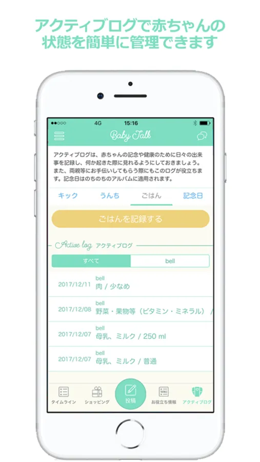 Active Logs allow you to record information that is important for managing your child's physical condition, such as meal and excretion. If you go to the hospital when you are in poor health, you can always communicate those information, so you can use it for early response, judgment of the condition, etc.