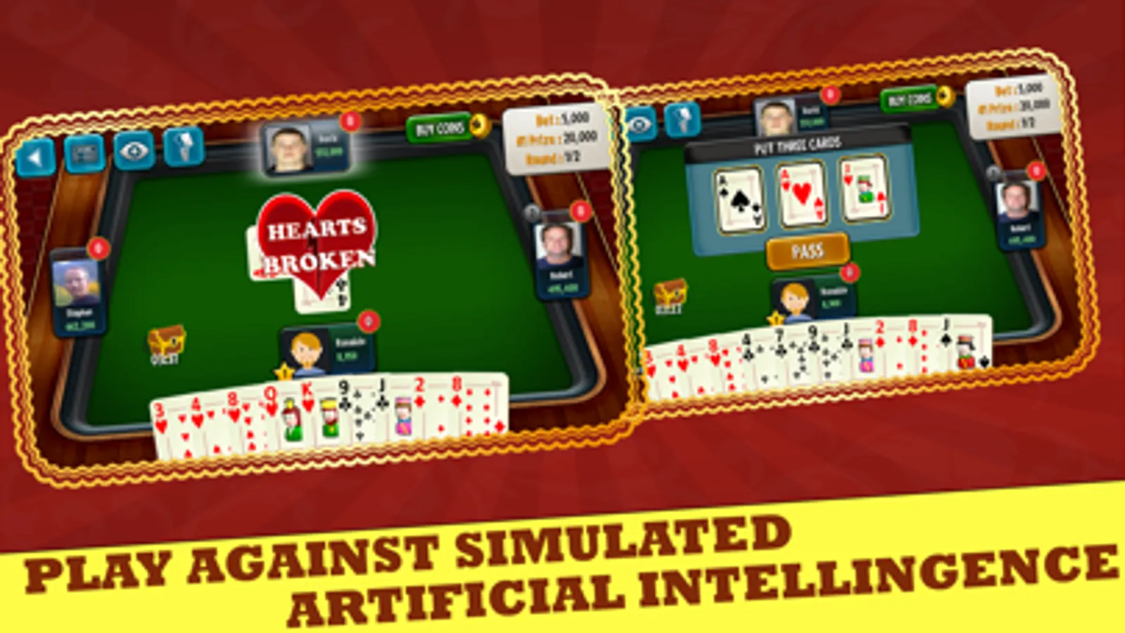 Hearts Free features an outstanding artificial intelligence engine. Difficulty levels ensure that you can play against a computer opponent that matches your skill level.