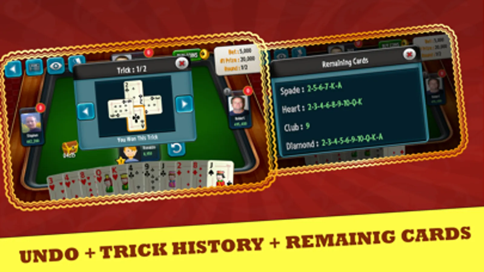 *TRICK HISTORY :- If you want to know which past trick won by which user and which cards were thrown to that trick, for that this feature will help you.