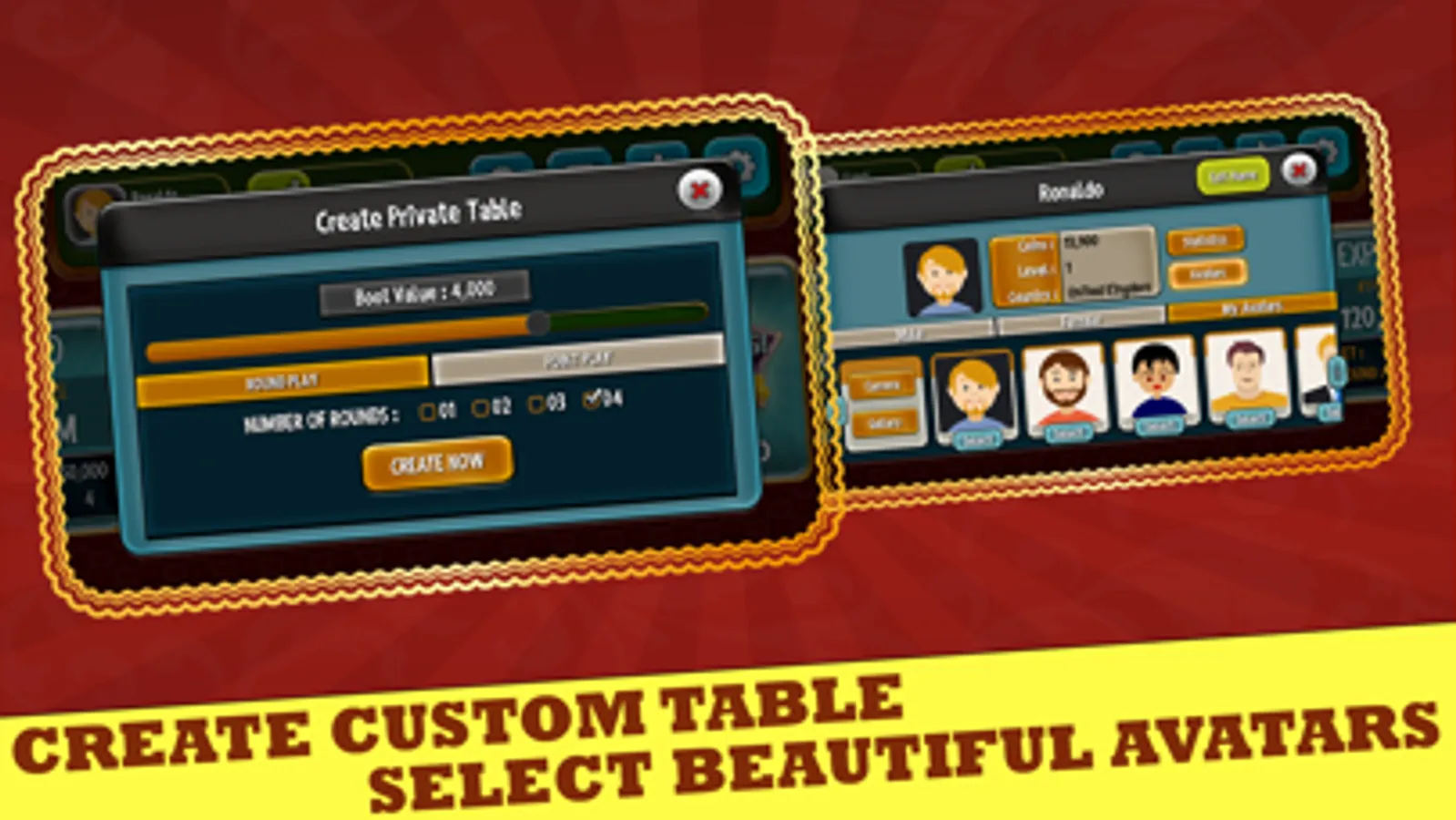 -Create Custom/Private Tables with custom bet amount, points and round.