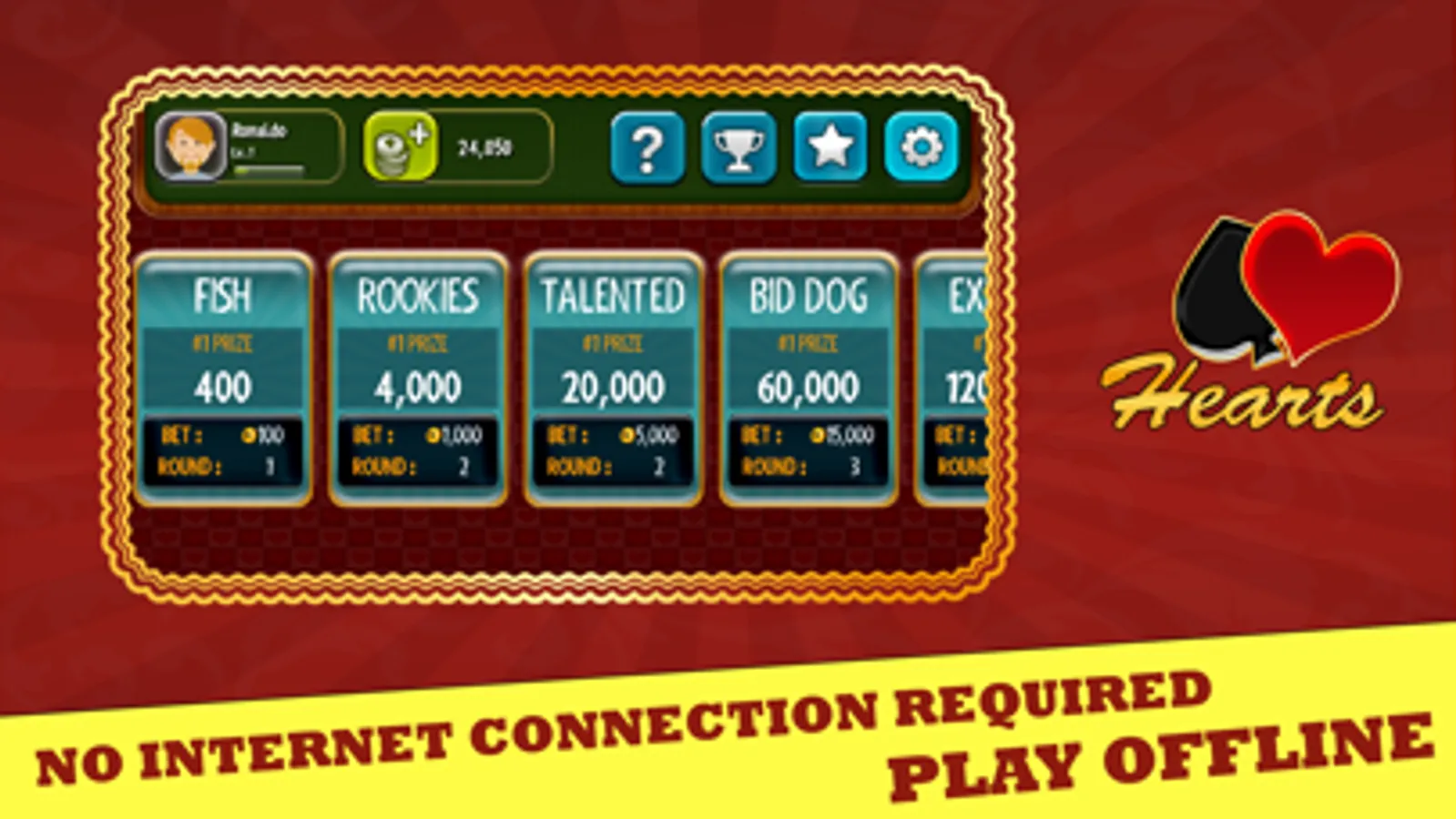The classic card game Hearts is now available on your mobile device. With rich graphics and smooth animations, Hearts Offline is the premier Hearts app on the app store - and best of all, it's free.