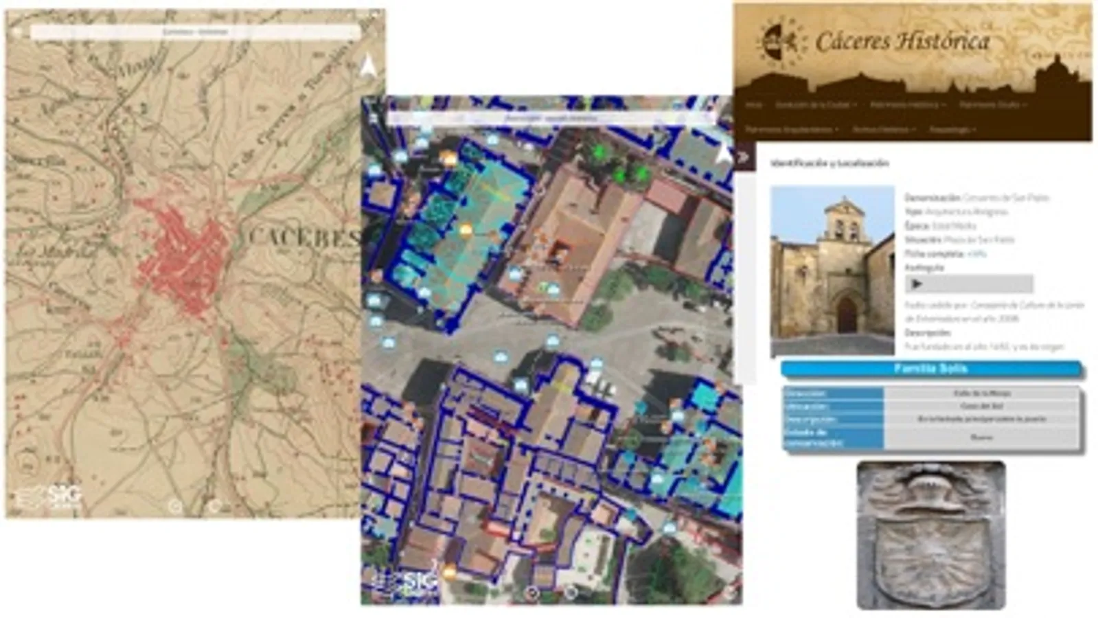 Toda información suministrada procede de los servicios WMS de la IDE de Cáceres (ide.caceres.es) gestionada por SIG municipal (sig.caceres.es y cacereshistorica.caceres.es ) y de servicios WMS de la IDE de España y de Extremadura, y de la Dirección General del Catastro.