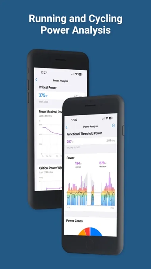 HealthFit provides advanced running power analysis with the automatically estimated critical power, the weighted average power, the power distribution chart by 25W Increments and the mean maximal power chart which shows your best average power for time periods of one second up to the length of your run.