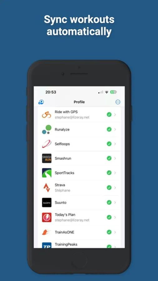 Strava, TrainingPeaks, Final Surge, Selfloop, Smashrun, MapMyFitness, MapMyRun, MapMyBike, Ride with GPS, Cycling Analytics, Today's Plan, Runalyze, Suunto, 2PEAK, Xhale, Komoot, Map My Tracks, Stages Link, TrainAsONE, Tredict, Intervals.icu, Nolio, COROS. Plus export to Google Sheets, FIT and GPX file formats.
