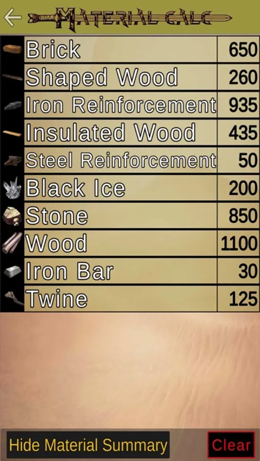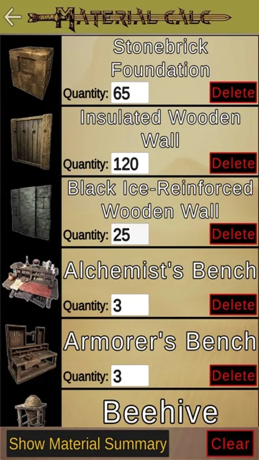 - Material Calculator, add any number of items or buildings and set the amount you require and the App will tell you the total materials needed.