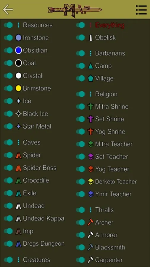 - Fully Dynamic Map (Zoomable and Pannable) with Coordinates. Toggle-able Markers for over 500 items including Resources Nodes(Iron, Coal, Crystal), Monsters, Religious Shrines and Teachers, Caves, Barbarian Camps and Villages.