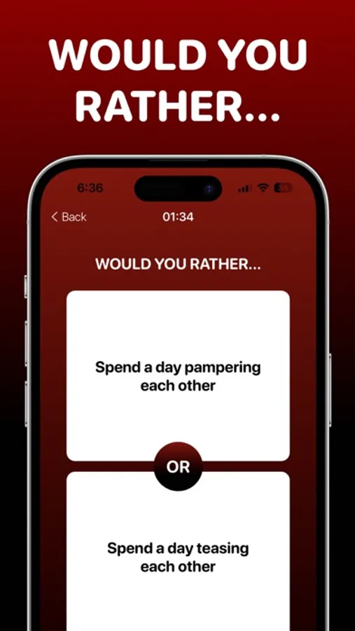 Looking for a way to learn more about your partner? Try our "Would You Rather" game, perfect for enriching the bonds between couples or friends. Begin a game in complete privacy with no account required. With a variety of content spanning over 12 diverse categories, there's something to suit everyone's taste.