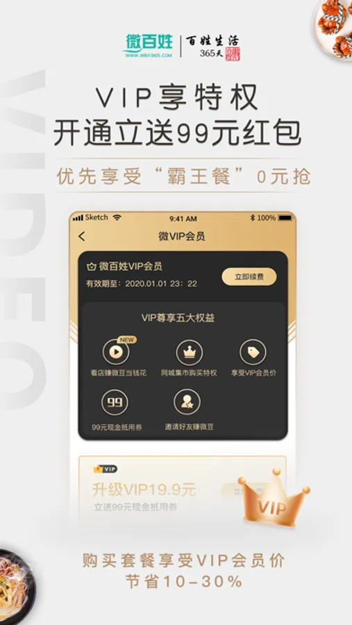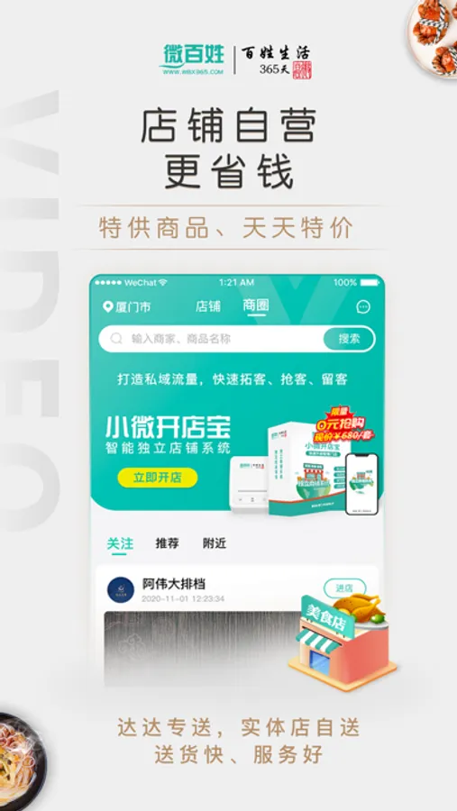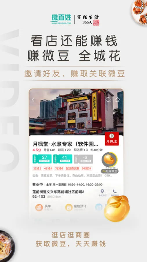 微百姓-为百姓省钱!微百姓APP,年轻人的吃喝玩乐实体店短视频平台,在这里发现美食、好玩、好看、真实、多元的世界,找到你想要的美好生活。【探店达人】在这里有海量实体店美食,美食达人,吃货网红,美女推店,厨师手艺等精彩的内容。探店达人可以美食分享,绑定实体店套餐赚取佣金,躺着赚钱。【实体商家】免费开店,探店达人免费推店,自动获客,实现线上与线下的真正融合,通过短视频的宣传方式,达到知名度、到店、购买、配送、预约等众多功能服务,更有资本助力。开店就领取1000元推广金,赶快来开店吧!【消费者】一个实体店自己的线上店铺平台,消费更省钱。各种达人推荐,让你少走弯路。