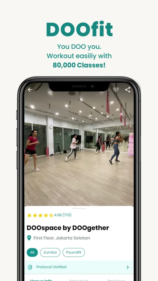 You can search and book 80,000+ workout classes, 35+ types of sports, and 350+ workout studios and trainers with DOOfit. Whether it's a class that you're looking for, you can find many workout classes to sweat here and there with no hassle at all! From yoga, pilates, strength and condition, martial arts, to wall climbing and archery – find it all here only on DOOgether.