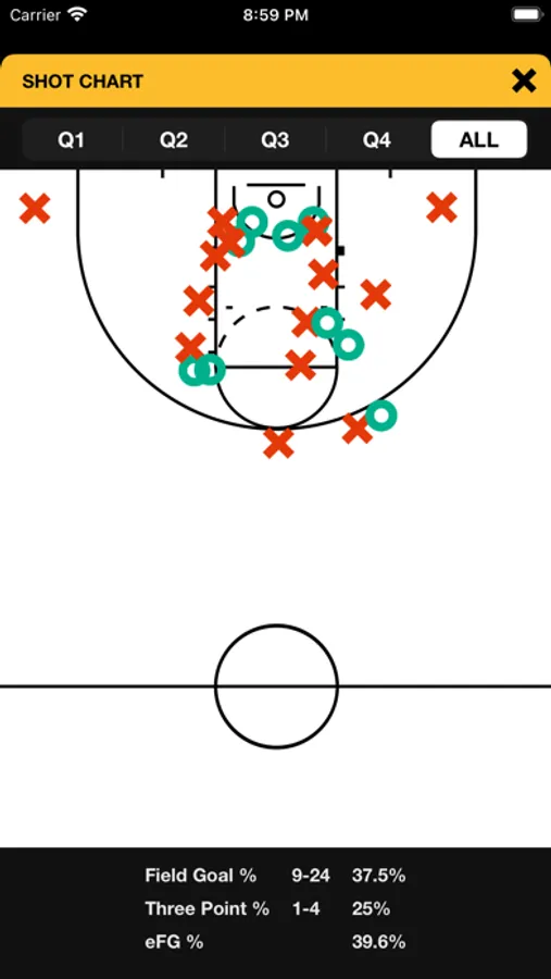 Each field goal make or miss location can be recorded and displayed in a shot chart. See your team's makes and misses for the full game, quarter-by-quarter or half-by-half. Court diagrams for high school, college and pro. See charts for individual players as well.