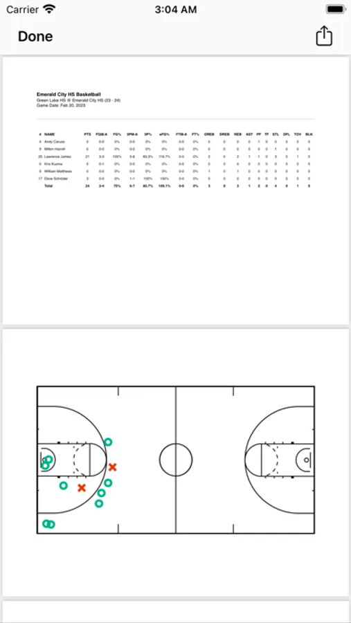 Save your team stats as PDF files which can be emailed, printed and shared to your team. The shot chart and play-by-play are included in the PDF report. Filter the PDF export for individual players or periods.