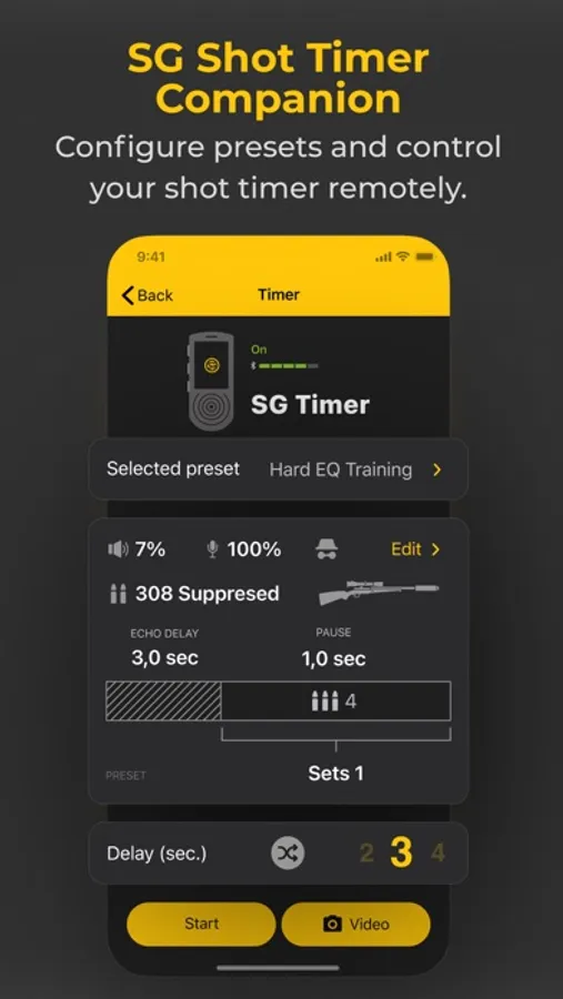 In the "History" section you can always view the detailed results of each training. Also, the application works in conjunction with a shooting timer SG-sensor. Working in pairs, the application and the sensor are synchronized and all data is immediately transferred to the screen of your phone.