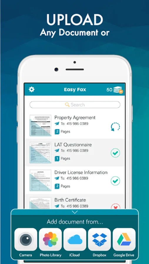 Scan any documents with Easy Fax's advanced built-in scanner or add images from your camera roll and fax them anywhere with a few taps. You can also choose documents from your favorite cloud services, iCloud, Google Drive or Dropbox for faxing.