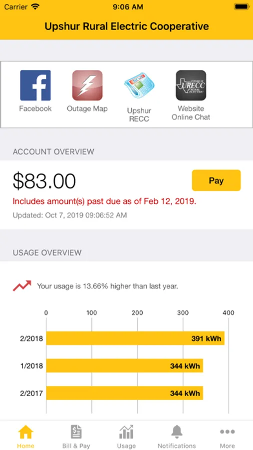 Upshur Rural provides URECC customers account management at their fingertips. Customers can view their usage and billing, manage payments, notify customer service of account and service issues and receive special messaging from URECC.