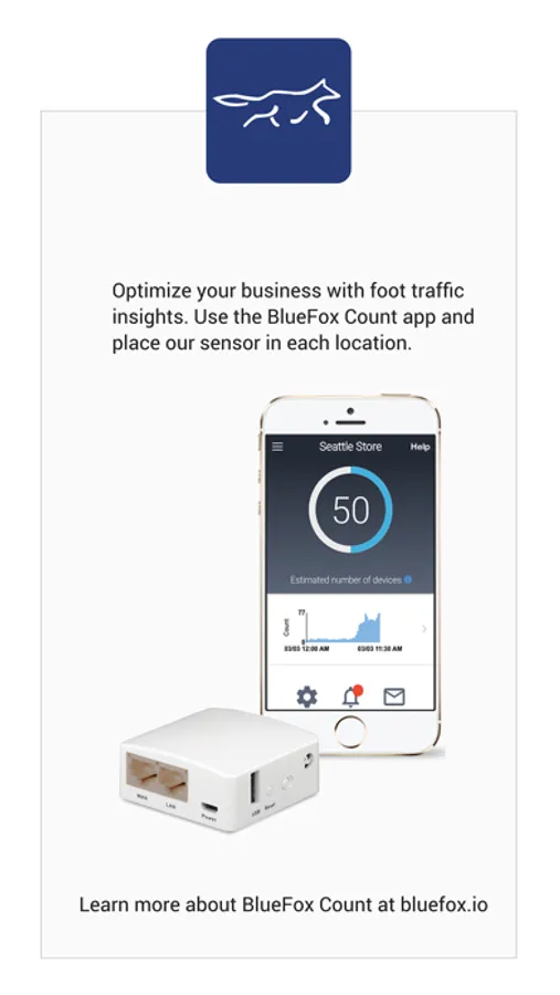 BlueFox Count senses and counts mobile phones in a location using Wi-Fi. With BlueFox Count, you not only get real-time counting but you can also trigger actions when the traffic count reaches the threshold you determine. Finally, foot traffic can be measured and monitored without the use of a beacon or a custom retail app.