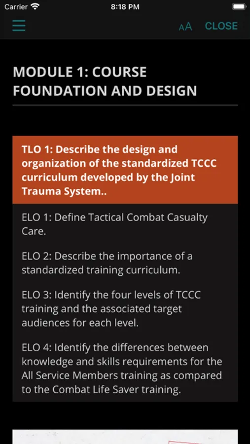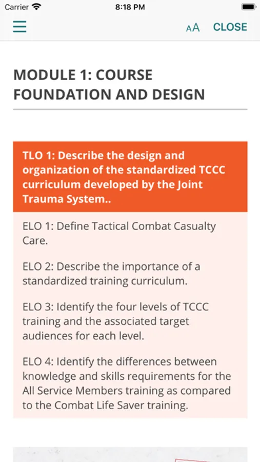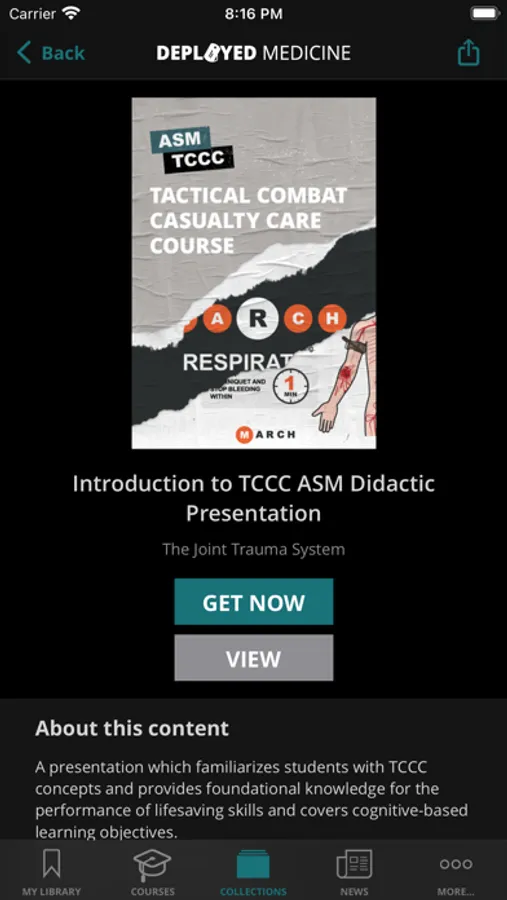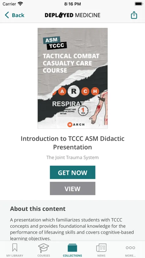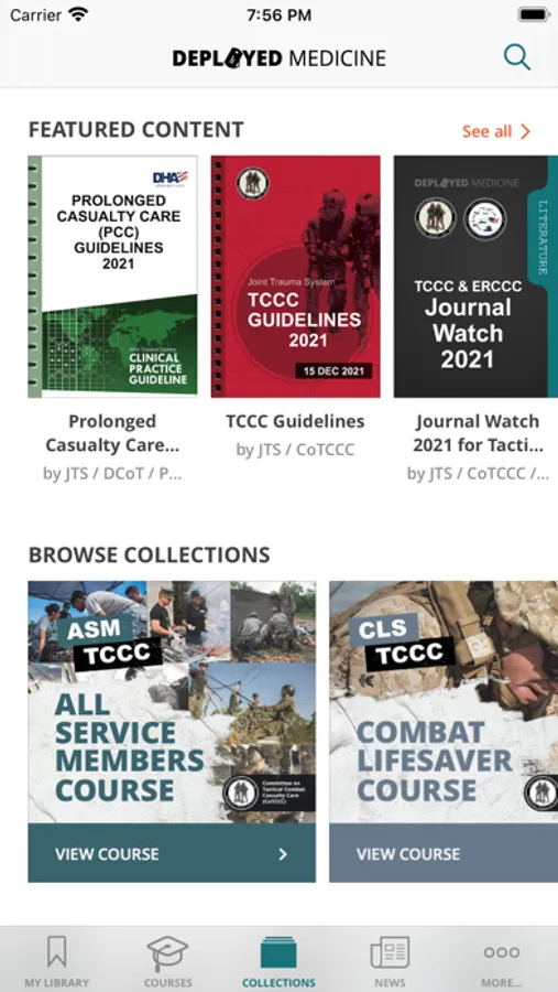 The medical content currently focuses on tactical combat casualty care (TCCC) training for combat medical personnel, and includes topics, such as hemorrhage control, airway management, hypothermia, pain control and care of wounds and splinting etc. TCCC focuses of providing the information you need to know to assess, treat and stabilize a patient at the point of injury.