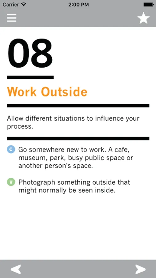 On each screen you will find a description of a creative method along with a question to consider, an example, or some advice to help you implement the method.