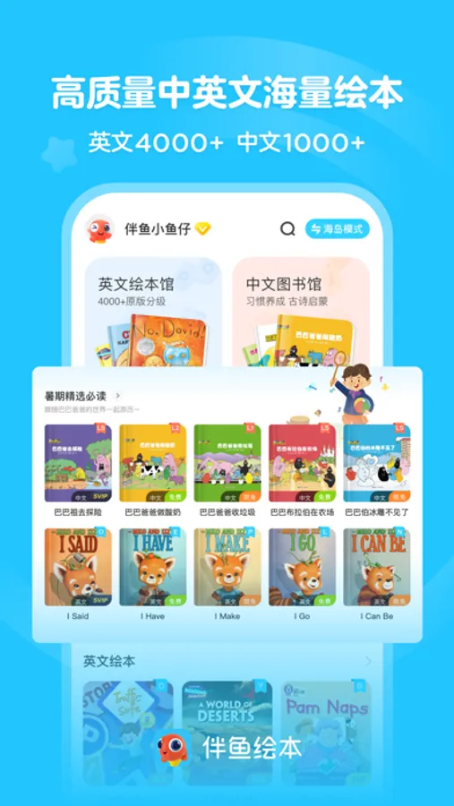 伴鱼绘本把英语经典绘本、中文趣味故事、睡前故事、童话故事等通过手机和iPad呈现在孩子们面前。让有趣的故事陪伴孩子,让孩子的童年充满快乐。