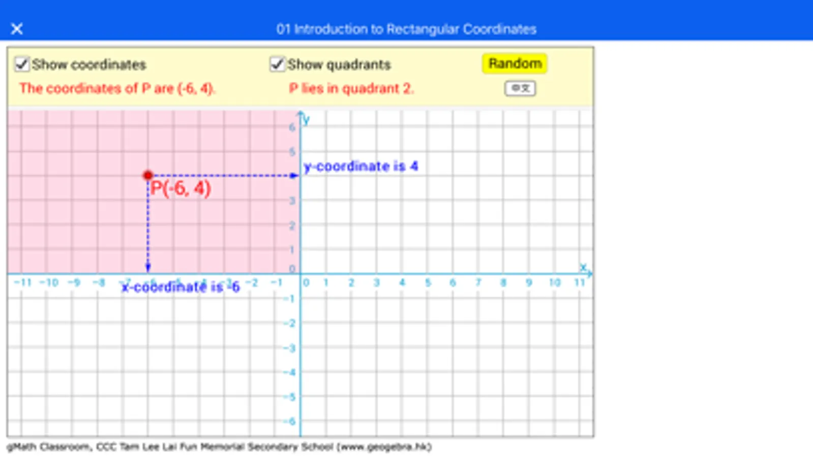 This app is a collection of GeoGebra applets designed by teachers of The Church of Christ In China Tam Lee Lai Fun Memorial Secondary School (中華基督教會譚李麗芬紀念中學) located in Hong Kong. It aims to help students to learn Mathematics in an interactive way and develop a deeper understanding of the subject. These applets are deliverable results of an ongoing project funded by the Quality Education Fund of Hong Kong SAR Government.