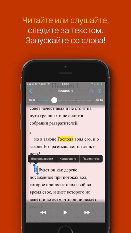 ・Воспроизведение с выбранного слова при помощи долгого касания;