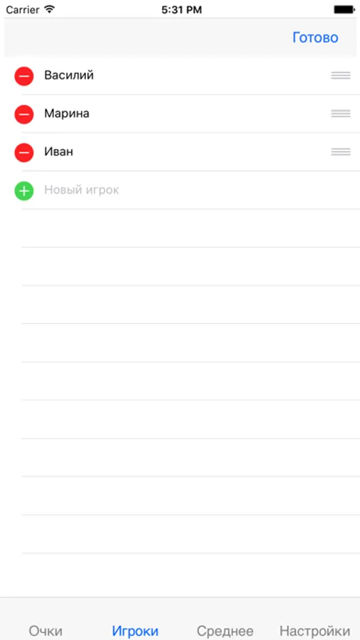 На экране "Игроки" можно составить список игроков: добавить, удалить, отсортировать и изменить имена.