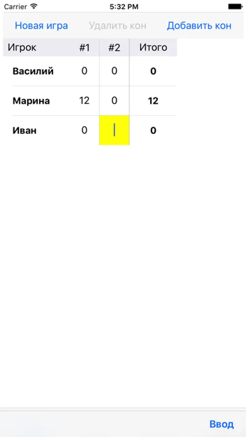 При нажатии "Добавить кон" добавляется новая колонка для записи результатов очередного кона.