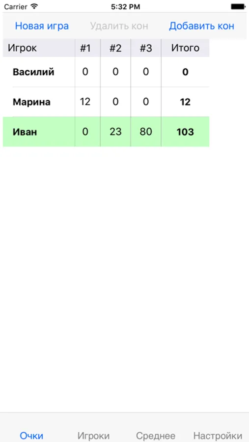 На экране "Очки" можно записывать текущие результаты. При нажатии "Новая игра" удаляются все колонки с очками и партия начинается с начала.