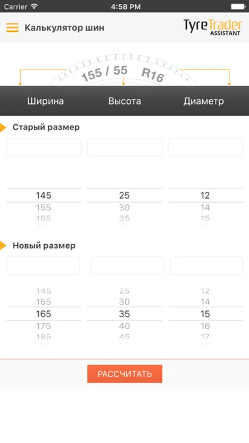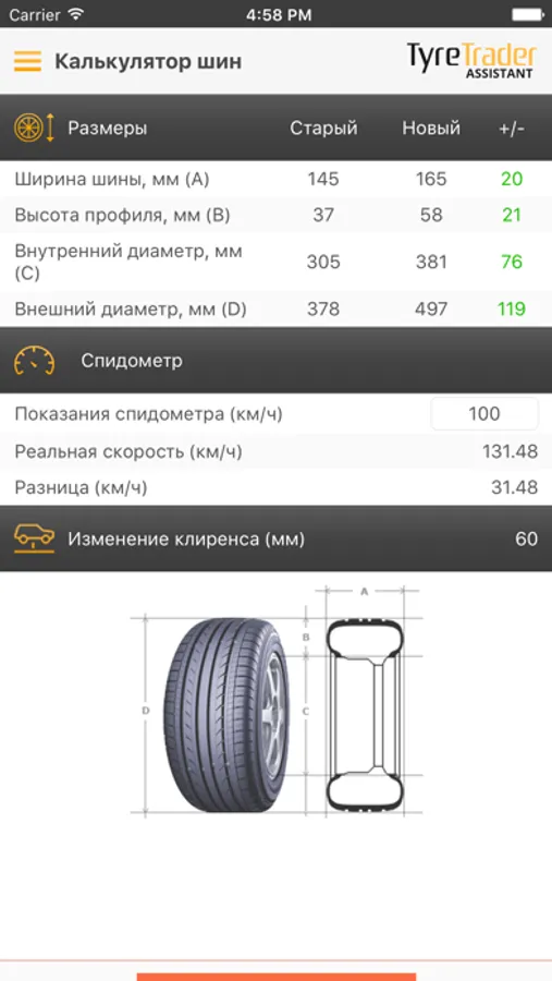 - Шинный калькулятор позволяет правильно подобрать размер шины при переходе к другому диаметру, либо оценить отличия в геометрических параметрах колес при переходи к другому типоразмеру