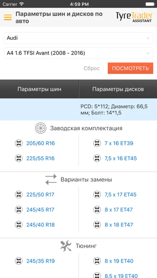TyreTrader ассистент – информационное приложение о шинах и дисках, которое включает следующие полезные разделы: