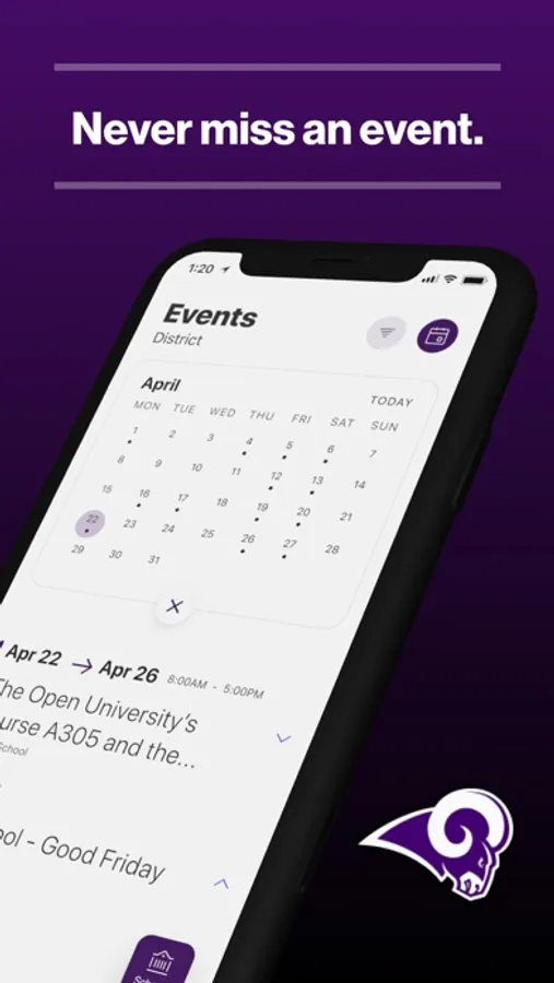 The event section shows a list of events throughout the district. Users can add an event to their calendar to share the event with friends and family with one tap.