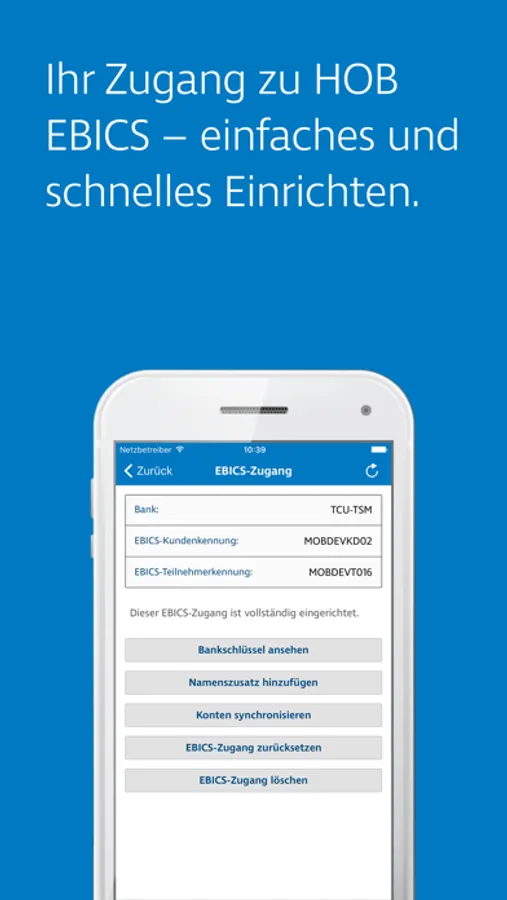 Alle sicherheitsrelevanten Daten, wie die EBICS-Schlüssel werden ausschließlich auf Ihrem Gerät verschlüsselt und abgelegt.
