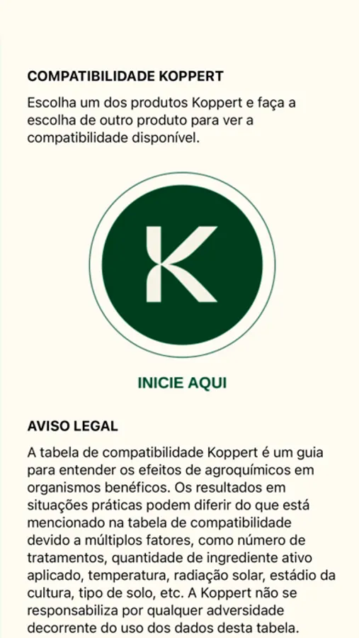 A tabela de compatibilidade Koppert é um guia para entender os efeitos de agroquímicos em organismos benéficos. Os resultados em situações práticas podem diferir do que está mencionado na tabela de compatibilidade devido a múltiplos fatores, como número de tratamentos, quantidade de ingrediente ativo aplicado, temperatura, radiação solar, estádio da cultura, tipo de solo, etc. A Koppert não se responsabiliza por qualquer adversidade decorrente do uso dos dados desta tabela.