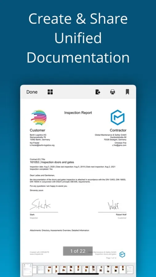Inspect power-operated doors and gates as well as fire doors and fire gates even faster and more efficiently. The entire inspection process, from the preparation of checklists, to the actual inspection on site, to the reporting, is standardized and digitalized. For more software and apps in the field of occupational safety, health and maintenance, please visit our website.