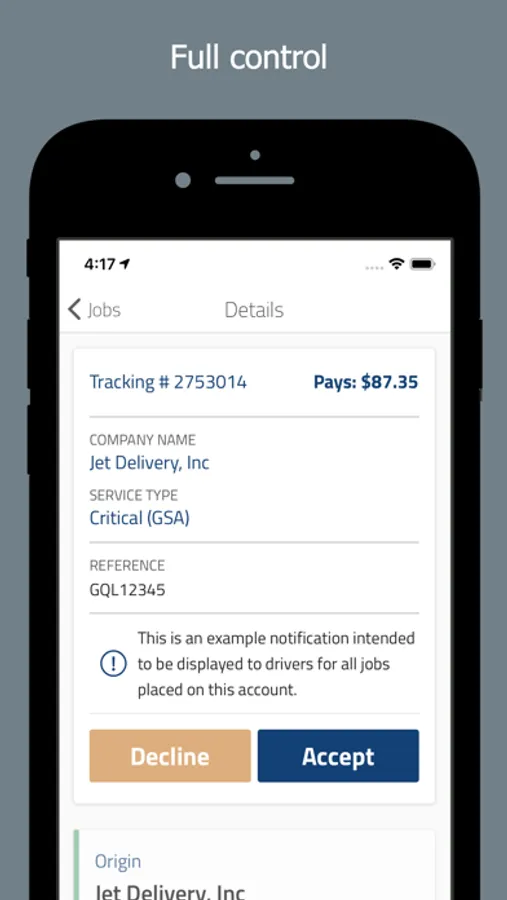 This app provides customers and partners with real-time tracking data, as well as sophisticated arrival estimates. Users can share their tracking number to any interested parties, so they, too, can track shipment progress. This app also provides tools for those who drive for Jet Delivery. Users can make themselves available for work, receive jobs, update the status of those jobs, upload documents, use intelligent route planning, etc. For drivers, while available to receive jobs, location data is collected and sent to Jet Delivery, so our Location Enabled Asset Finder (LEAF) can automatically dispatch jobs as they come up. Both individuals and organizations are welcome to join the Jet Delivery platform.