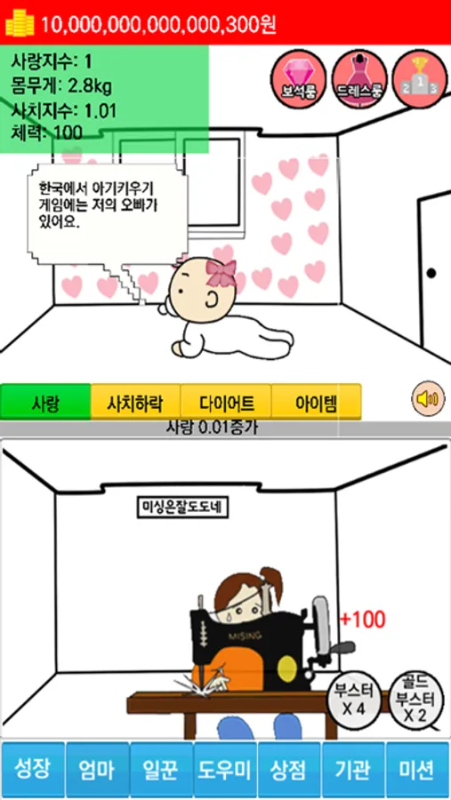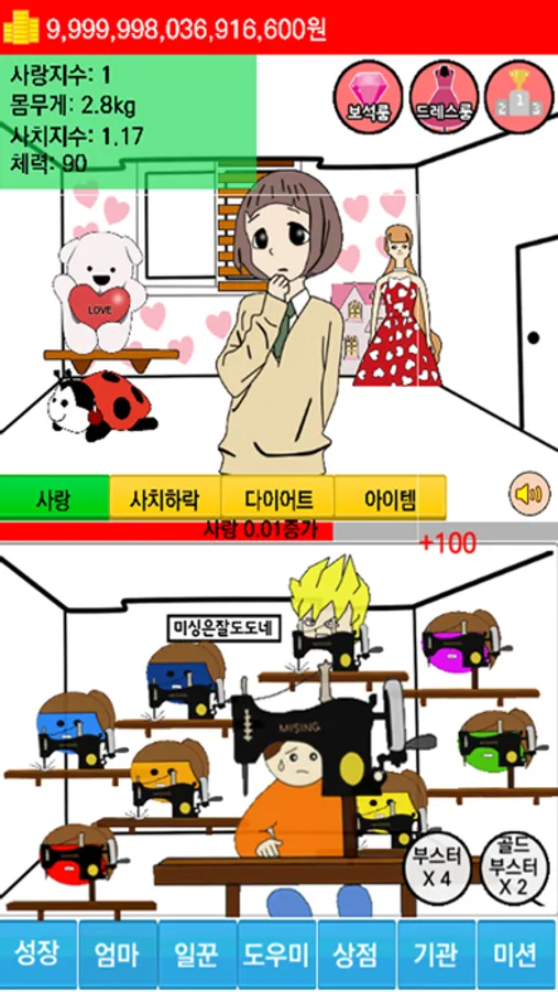5. 사치지수는 시간이 지나면 자동으로 증가하며, 체력도 시간이 지나면 자동으로 떨어집니다.