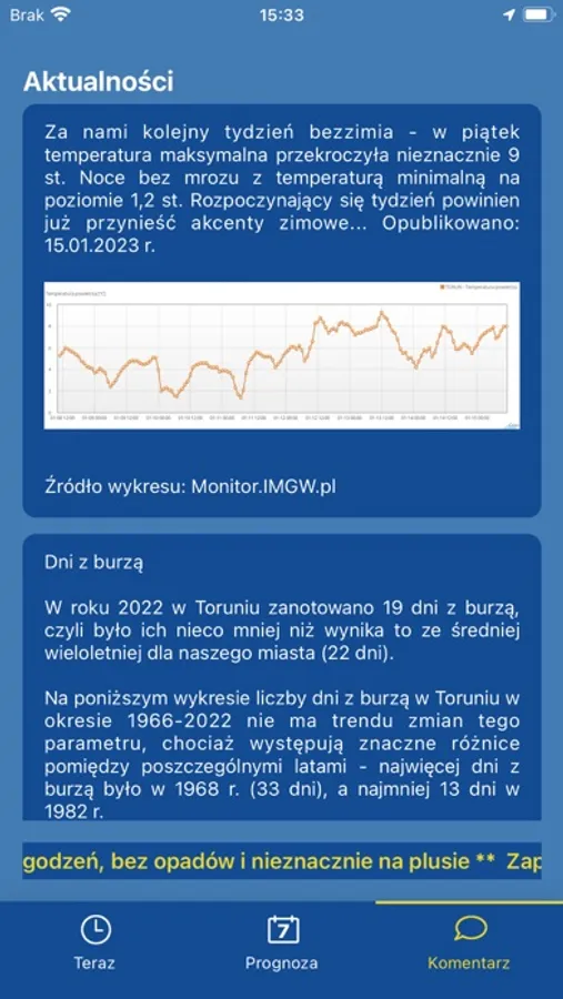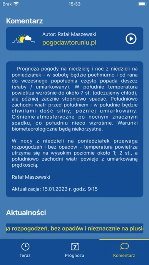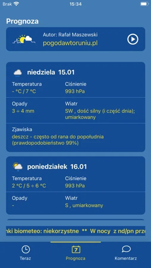 The app presents meteorological data for Toruń - a city in Poland. Forecast by Rafał Maszewski.