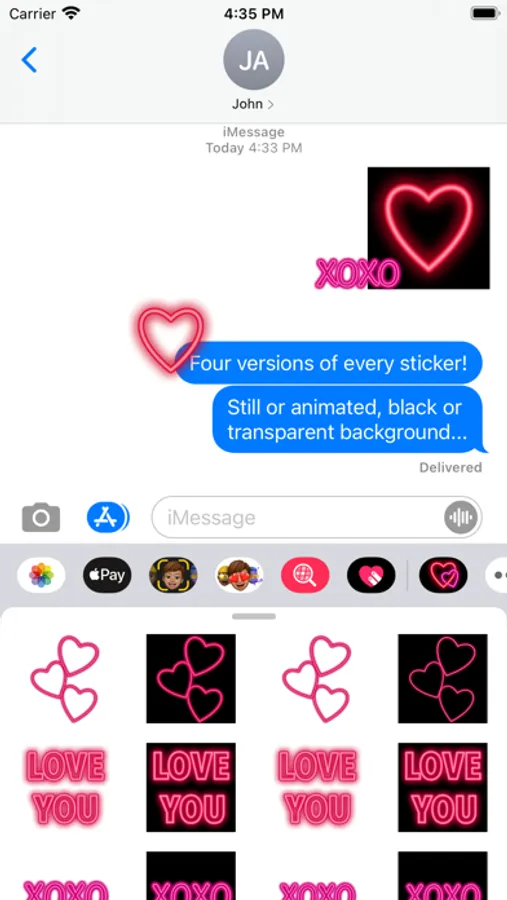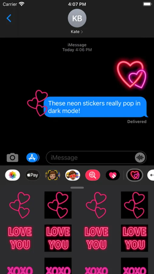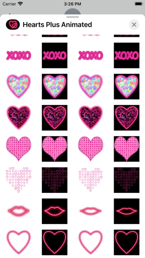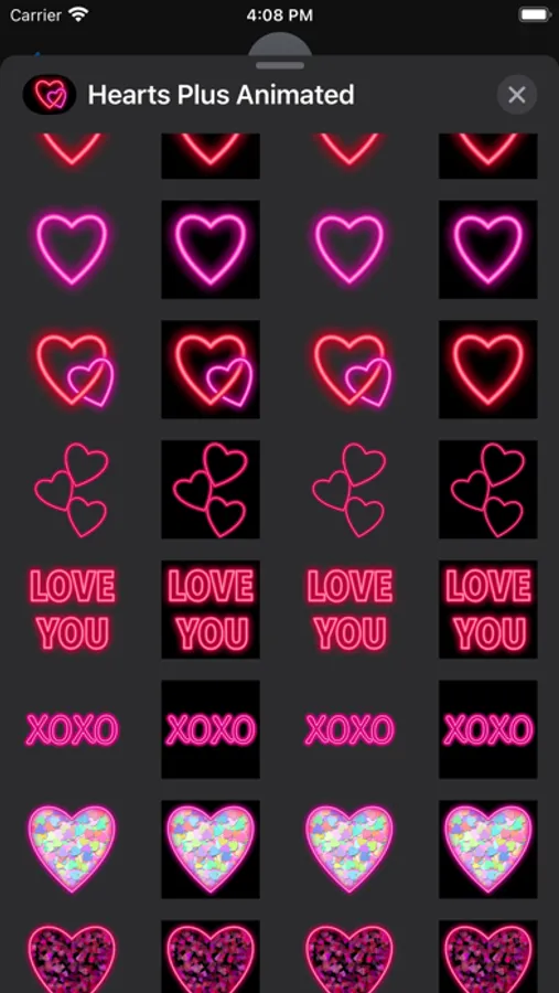 This animated sticker pack for iMessage includes neon hearts, linked hearts, filled hearts, and more. The neon colors take full advantage of the wide gamut display on the latest devices and look fantastic in dark mode.