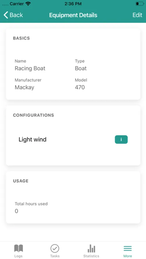 Do you really know how much your equipment is used? In the Equipments menu you can manage your boats, sails and other accessories. You can even create settings, such as 'Light wind' for your equipment. This is handy when you need to decide which one to take to the regatta.