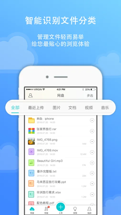 * 智能识别图片,视频,文档,音乐等分类整理云盘文件,给您最贴心的浏览体验。