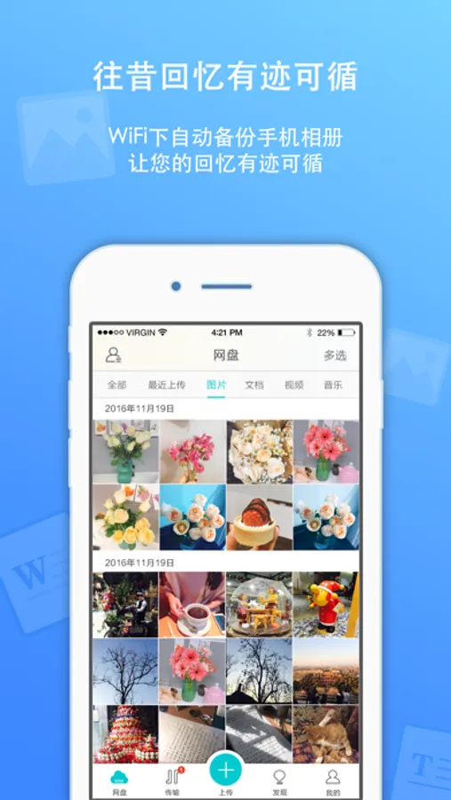 * WiFi下自动备份手机里的照片和视频,释放手机空间,珍贵美照再也不怕丢。