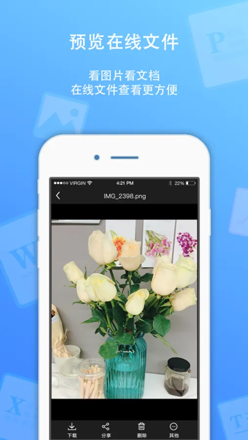 * 云端文件随时在线查看,支持照片,文档,PPT等文件格式。