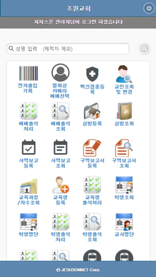 - 내 소속, 교인조회, 직분별, 교구, 부서, 교회학교 요람 열람