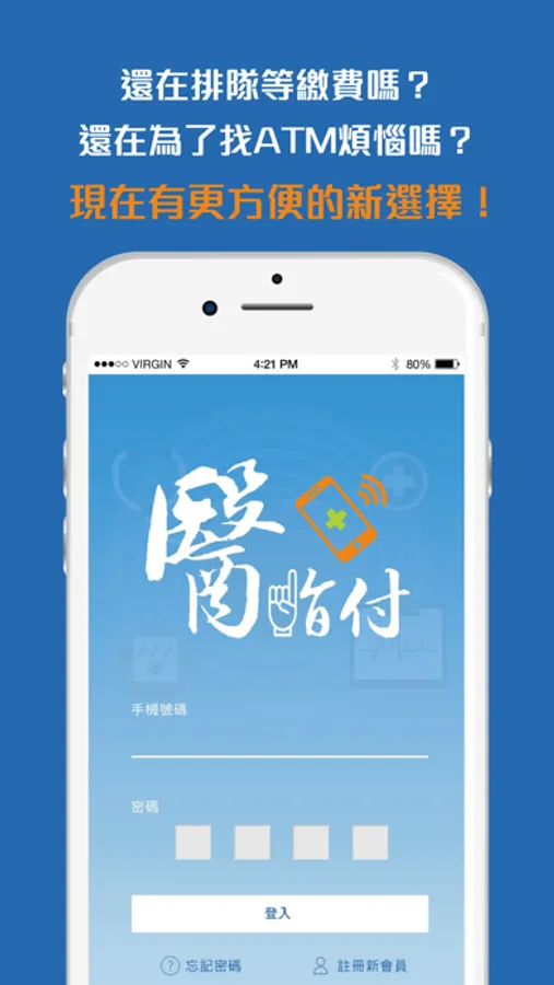 您只要下載「醫指付」APP,在看診後輸入自己或親友的資料,APP會顯示「應繳醫療費用金額」,再選擇「確定繳費」,即可直接至藥局拿藥,不論是門診、急診、住院費用都可支付。不用帶現金,不必到醫院批價櫃檯排隊,透過醫指付遠端刷卡操作繳費一指輕鬆搞定醫療大小事!"