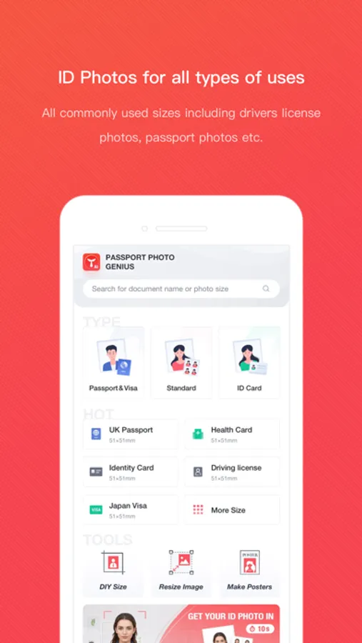 With Passport Photo Genius you can choose from official photo sizes for ID, Passport and Visa Application Photos for 100+ different countries. Alternatively, you can also choose a custom photo size. The resulting images can be printed directly.