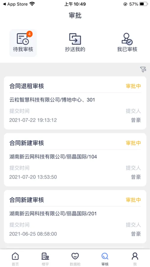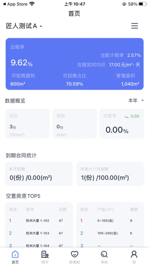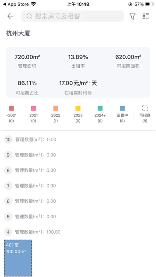 2.楼宇管理:可以清楚看到整个项目的总面积、已租面积、空置面积、可招商面积、租金、租期、合同审核操作的状态等信息,数据分布,直观清晰,实时掌控楼宇的租赁进程。